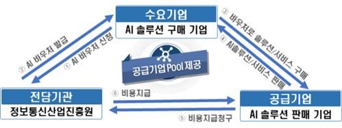 ㅇ 지원내용 : 수요기업이 필요한 AI솔루션을 공급기업에서 제공해주도록 요청하고, 제공 대가는 바우처로 지불하는 AI바우처 지원사업