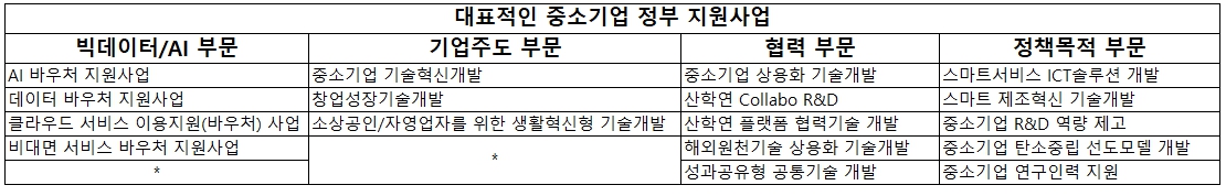 대표적인 중소기업 정부 지원사업을 아래 표와 같이 4가지 부문으로 분류하여 봤습니다.