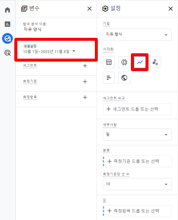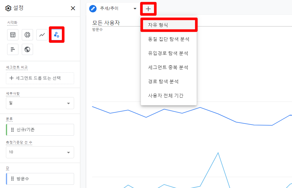 다양한 분석 종류 중, ‘자유 형식 탐색 분석’ 리포트를 활용해보겠습니다. 자유 형식 탐색 분석에는 막대, 원형, 선 등 다양한 차트의 종류를 제공하는데요, 그중, 추세를 살펴보기 용이하도록 ‘선 차트’를 사용해보겠습니다.