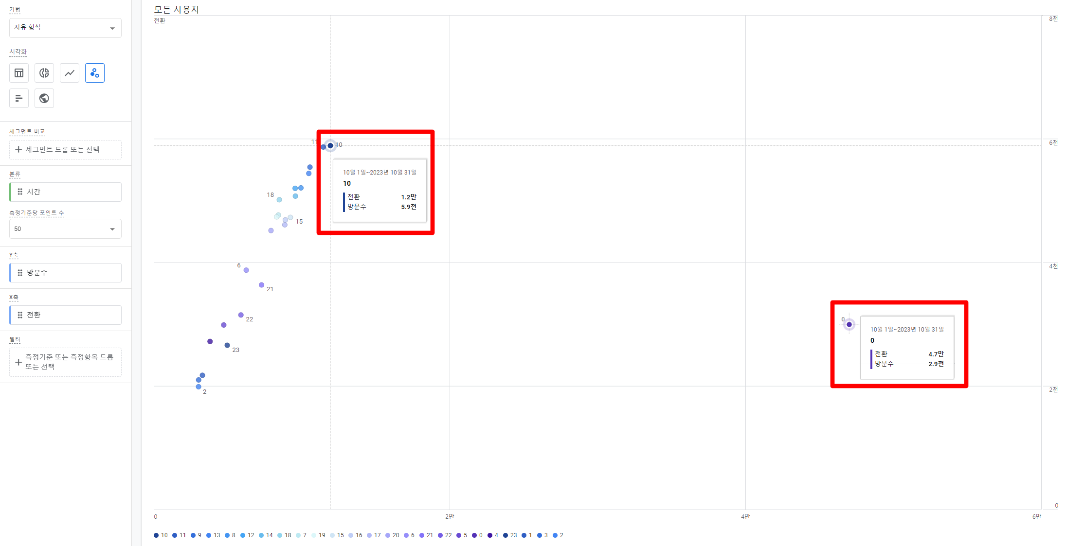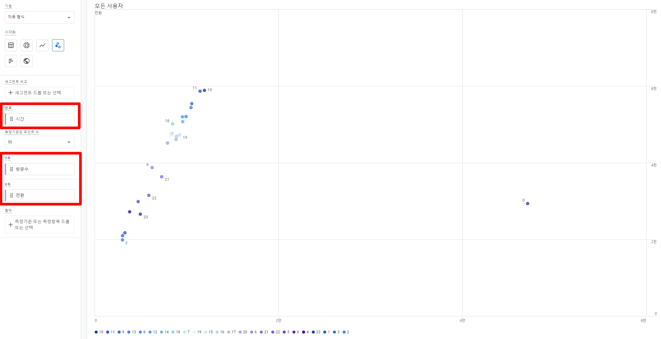 전체적인 추세를 확인했다면 이번에는 시간대별 방문을 살펴보겠습니다. 더 나아가 마케터들은 사용자들의 유입/방문뿐만 아니라 전환도 중요한 항목인데요, 이를 함께 비교할 수 있도록 ‘분산형 차트’를 활용하여 시간대별 방문과 전환을 비교해보겠습니다.