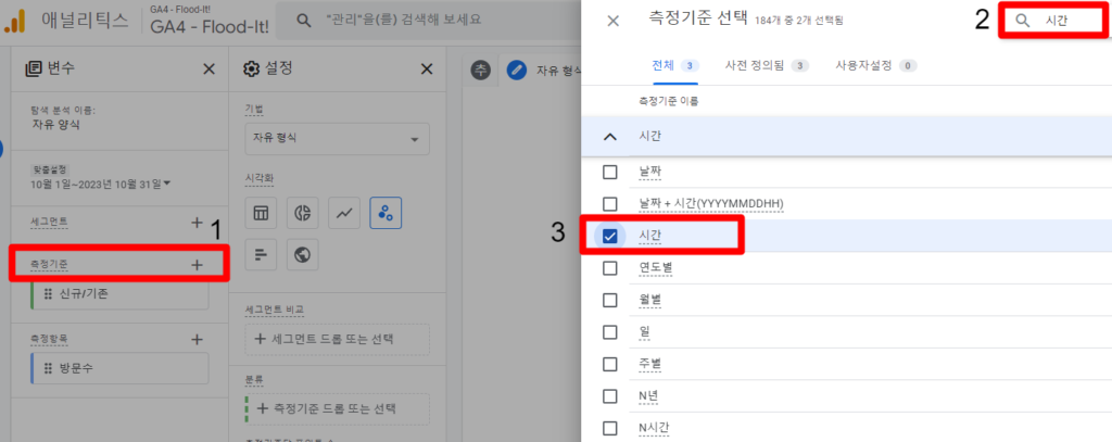 - 측정기준 + 아이콘 선택 > 검색창 > 시간 선택 순으로 해줍니다.