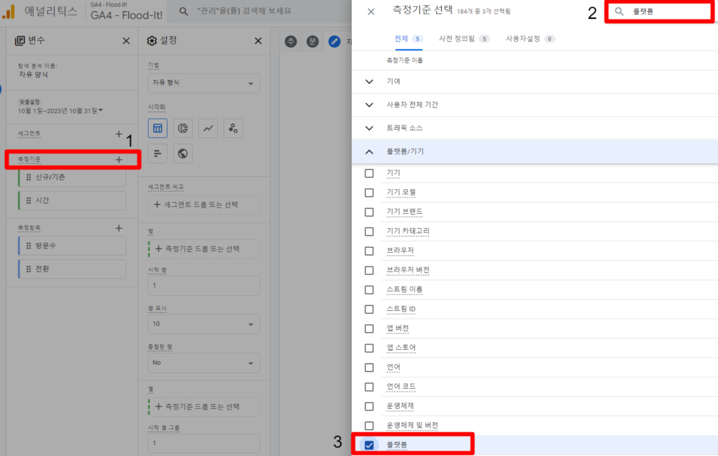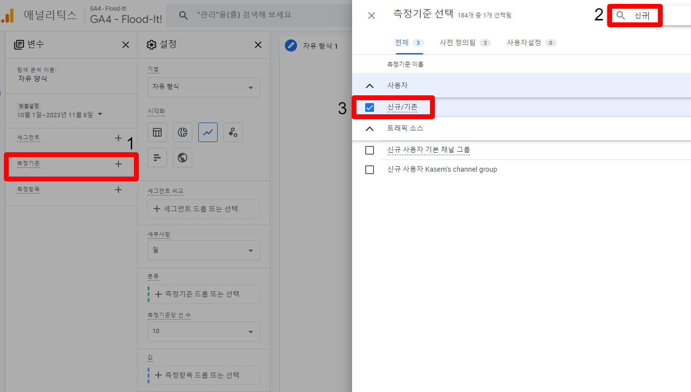 - 측정기준 + 아이콘 선택 > 검색창 > 신규/기준 선택 순으로 해줍니다.