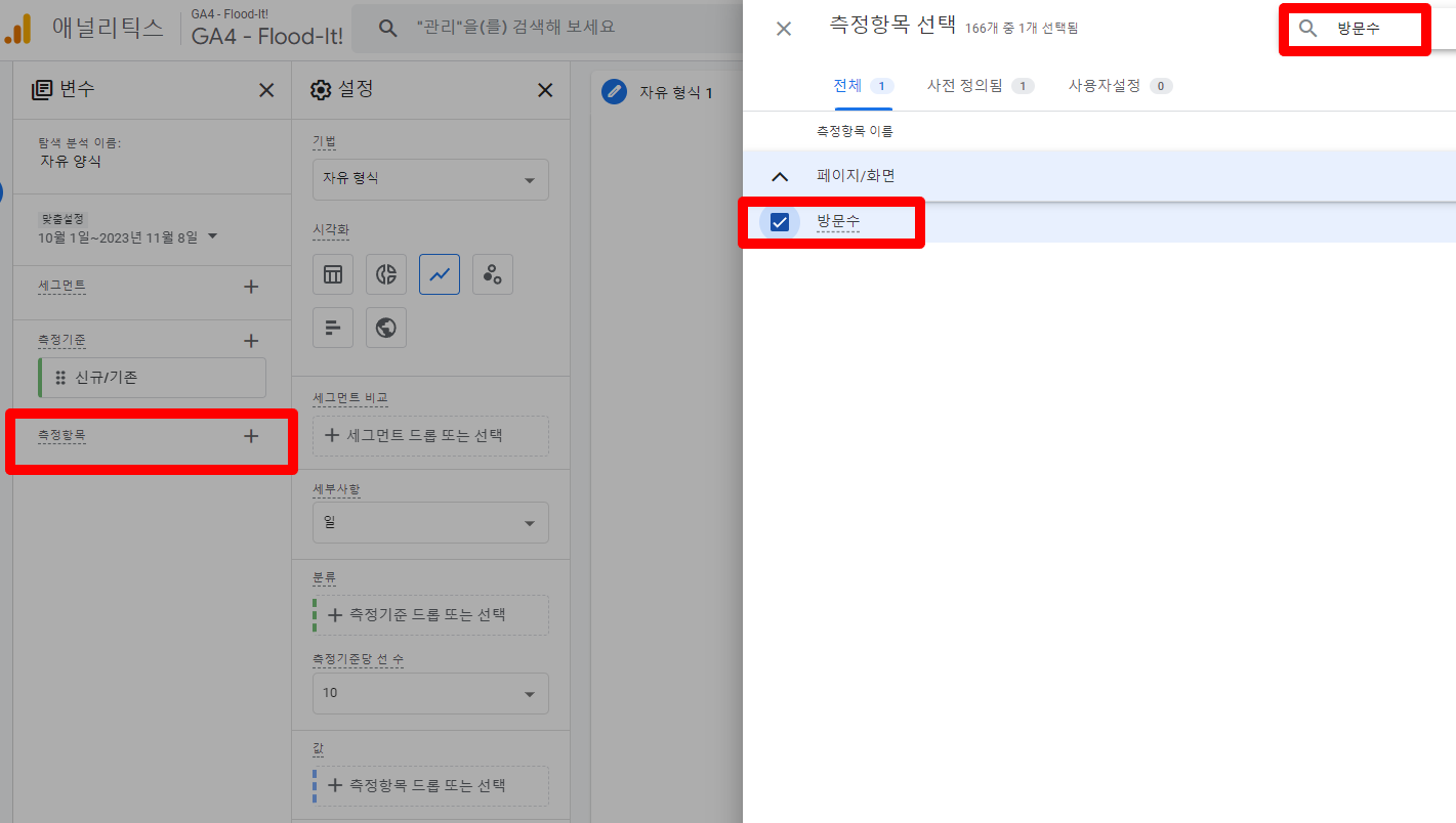 - 측정항목의 경우, 기존에 추가해놓은 ‘방문수’가 있어 재추가 하지 않아도 됩니다.