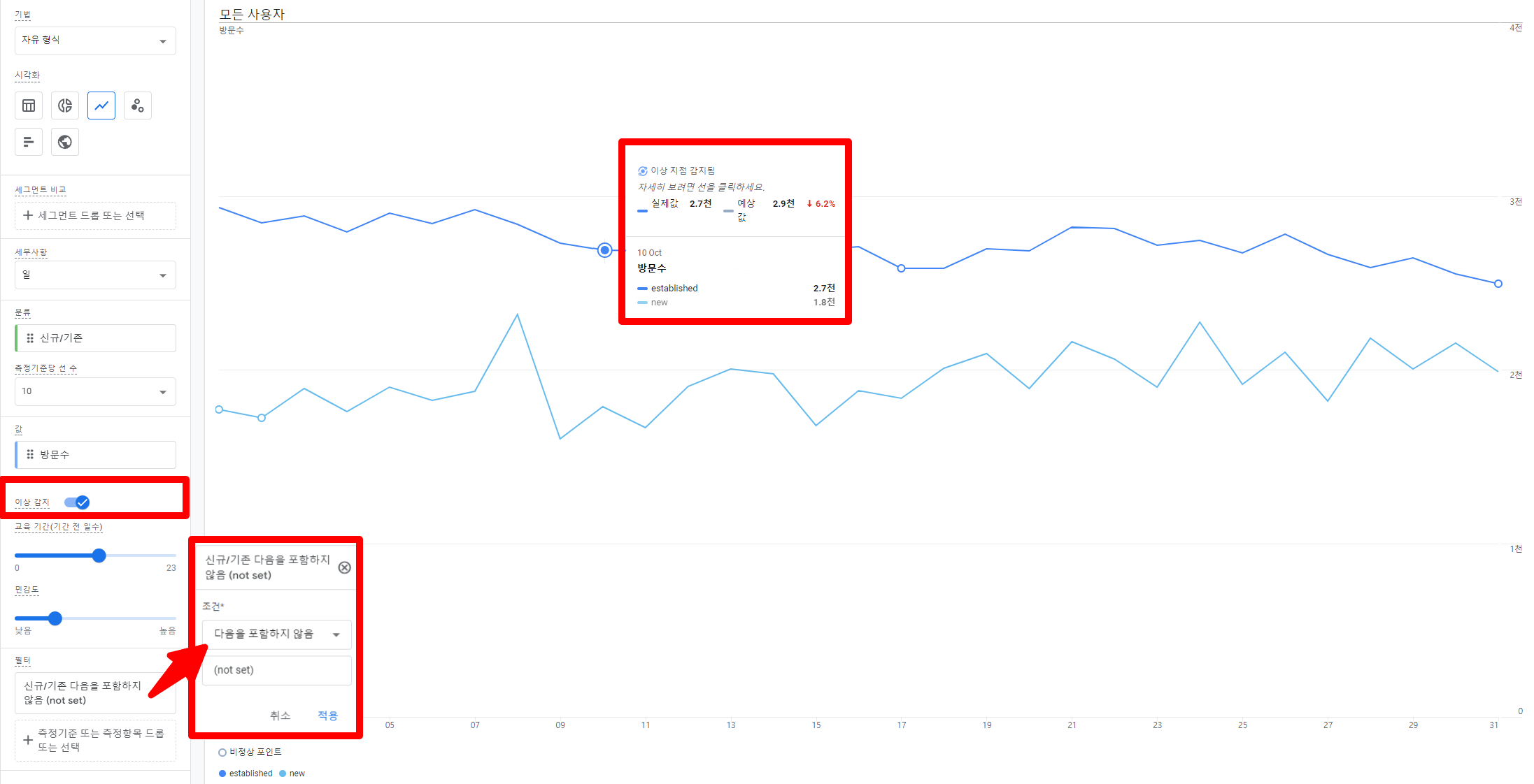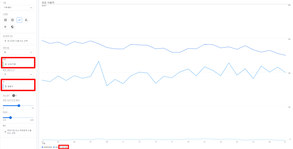 - 방문자 추세를 세분화하여 보기 위해 ‘신규/기존’ 항목을 측정기준으로 추가합니다.