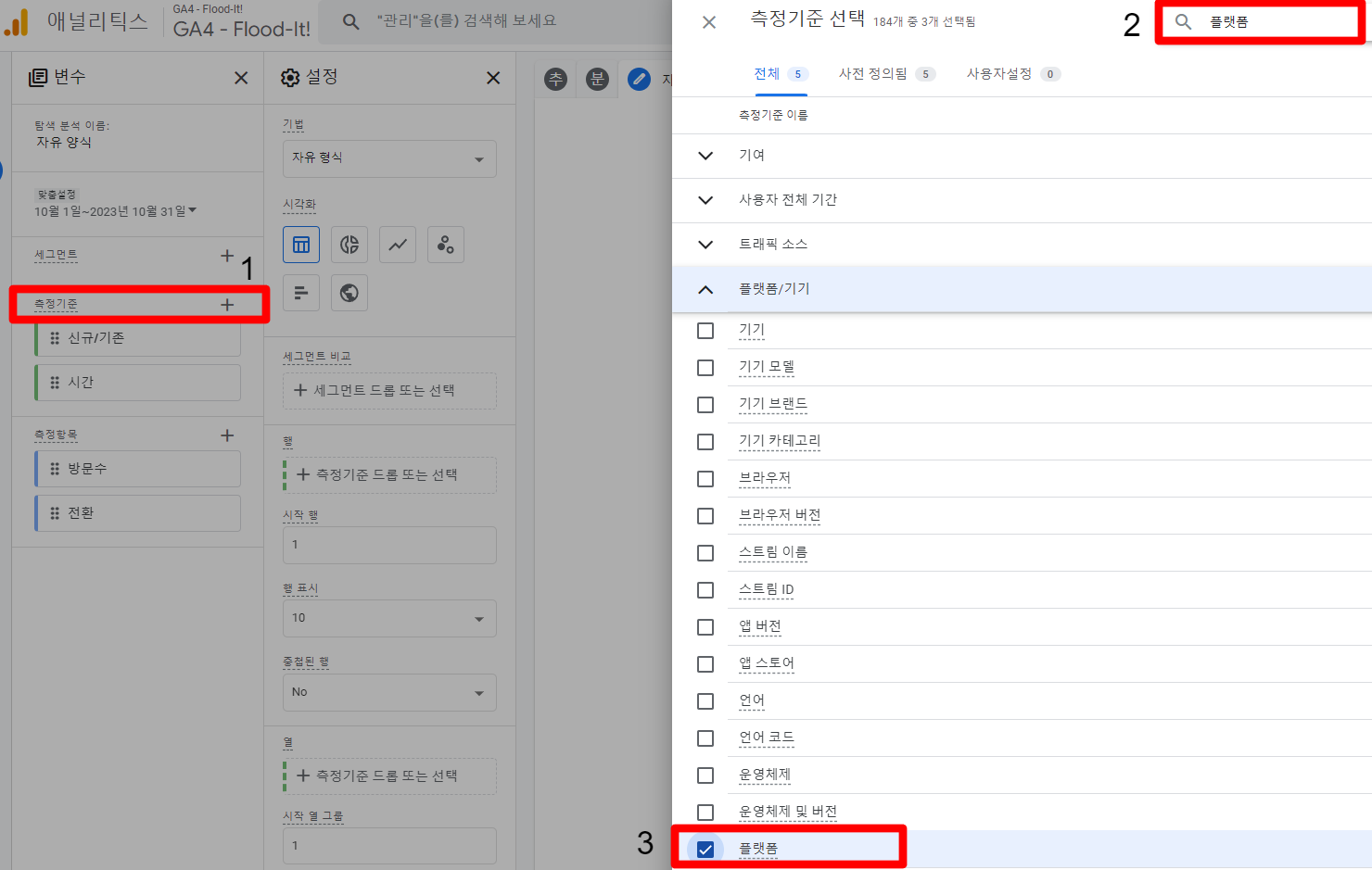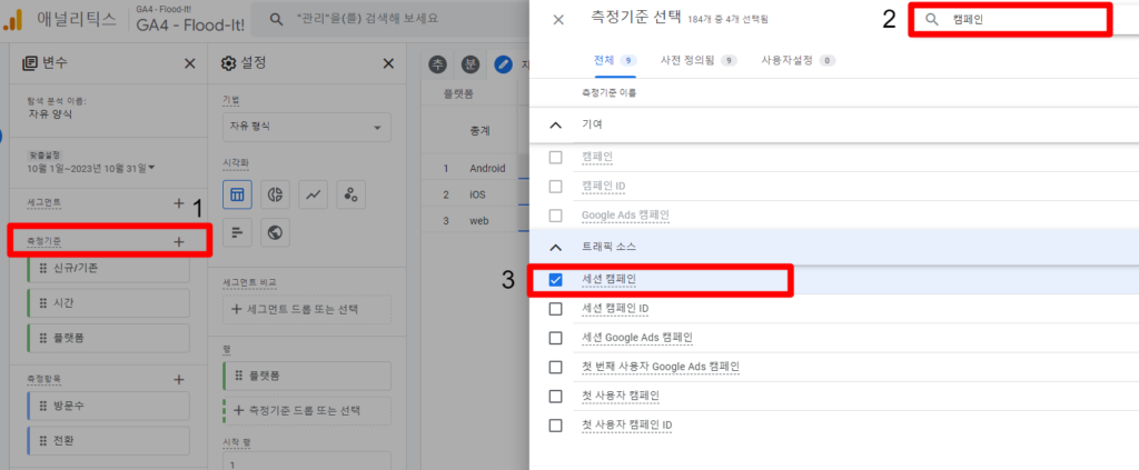 - 측정기준 + 아이콘 선택 > 검색창 > ‘세션 캠페인’, ‘플랫폼’ 선택 순으로 해줍니다.
