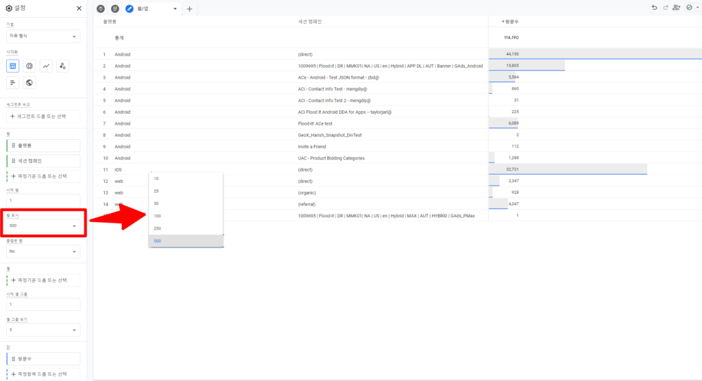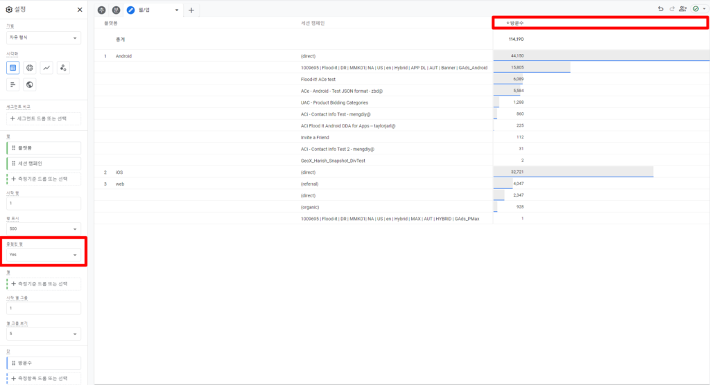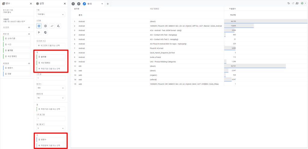 - ‘세션 캠페인’, 웹/앱별로 세분화하여 보기 위해 ‘플랫폼’ 항목을 측정기준으로 추가합니다.
