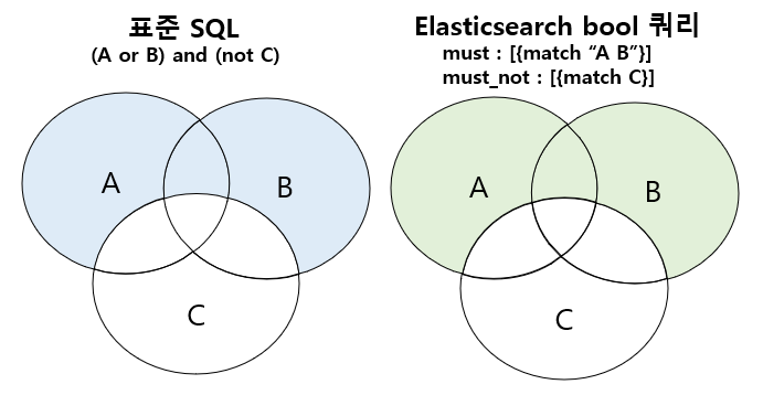 왼쪽에는 '표준 SQL' 벤다이어그램 차트가 있고, 오른쪽에는 'Elasticsearch bool 쿼리'에 대한 벤다이어그램 차트가 있는 이미지