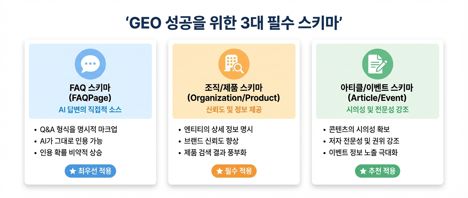 모든 스키마가 GEO에 동일한 영향을 주는 것은 아닙니다. 수백 가지의 스키마 중, AI 답변 최적화(GEO)에 직결되는 핵심은 다음 3가지입니다.
