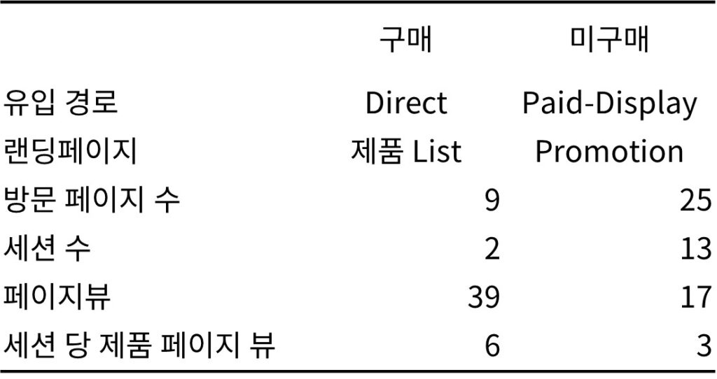 구매 고객의 경우에는 방문 페이지나 세션수는 미구매 고객보다 적었지만, 페이지뷰가 높았습니다. 구매 고객은 여러 번 방문하기 보다는 한번 방문에 여러 정보를 습득하고 구매를 빠르게 결정한다는 인사이트를 도출하였습니다. 미구매 고객은 그와 달리 자사몰 내 다양한 정보를 여러 날에 걸쳐 습득하면서 구매 고려 기간이 길어지며 이탈하게 되는 것이라고 해석하였습니다.