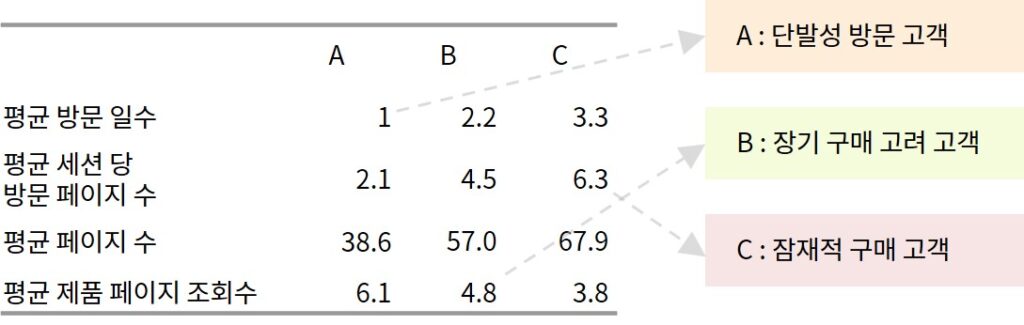 구매하지 않은 고객의 행동을 분석한 후 특징에 따라 세분화하였습니다. 평균 방문 일수, 평균 세션 당 방문 페이지 수, 평균 페이지 수, 평균 제품 페이지 조회수 등을 비교 분석하여 방문 패턴과 구매를 고려하는 기간을 파악하여 서로 다른 세그먼트로 분류하였습니다. 이 중에서 마케팅을 시도하였을 때 가장 구매 전환율이 높을 것이라고 예상되는 ‘잠재적 구매 고객’ 그룹을 발굴하였고, ‘장기 구매 고려 고객’의 경우에는 추가적인 혜택을 제공하여 구매 전환을 유도하려는 전략을 세웠습니다. 이렇게 고객 분석을 통해 세그먼트의 특징별로 시행할 수 있는 액션을 도출하였습니다.