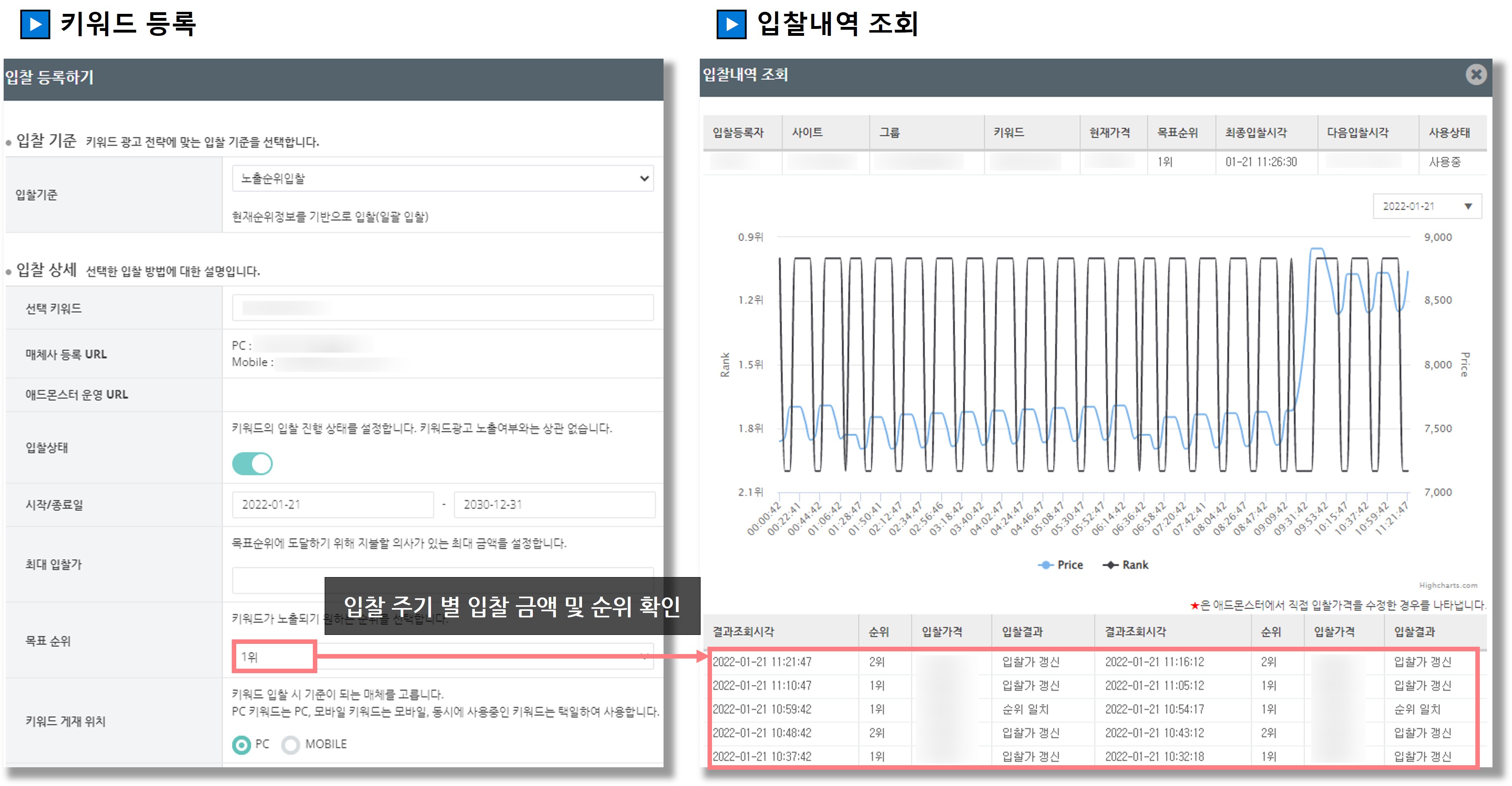 애드몬스터는 네이버 검색광고 자동입찰을 통해 키워드 목표 순위, 최대 입찰가, 예산 조건을 기준으로 입찰가를 자동 조정하여 실시간 경쟁 상황에 따라 입찰가를 상·하향 조정해 불필요한 고입찰을 방지하고, 안정적인 노출 순위를 유지할 수 있도록 하였습니다.