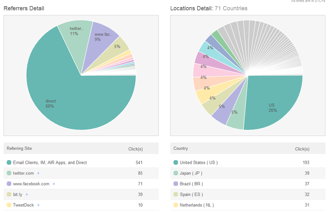 이외에 해당 링크클릭이 일어난 곳( 이메일, 트위터, 페이스북, 트윗덱 등)을 Referrers 리포트로 보여주고, IP를 기반으로 국가 리포트를 추가로 보여주기도 합니다.