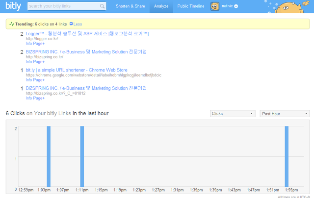 아래는 제가 몇개 링크를 등록해보고 클릭해서 시험삼아 만든것인데요, 아래처럼 실시간으로 클릭상황을 살펴보실 수 있습니다.